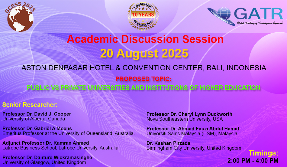 Global Academy of Training and Research (GATR), is a registered research firm in Malaysia that provides platforms for academics and organizations to excel. GATR aims at encouraging young scholars, established researchers, trainers, academic & corporate researchers to conduct meaningful research and provide useful knowledge for the academic and socio-economic development of their respective nations. GATR is organizing the academic discussion session in Bali, Indonesia.