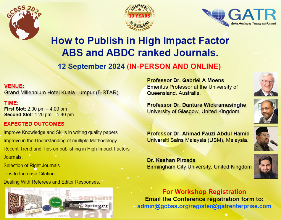 16th Global Conference on Business and Social Sciences (16th GCBSS) concurrent event workshop on ''How to Publish in High Impact Factor ABS and ABDC ranked Journals". The workshop is free for all registered 16th GCBSS guests.