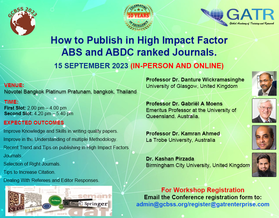 15th Global Conference on Business and Social Sciences (15th GCBSS) concurrent event workshop on ''How to Publish in High Impact Factor ABS and ABDC ranked Journals". The workshop is free for all registered 15th GCBSS guests.