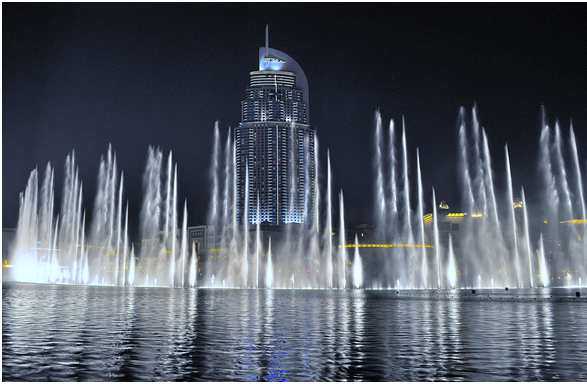 Set on the 30-acre Burj Khalifa Lake, the fountain shoots water jets as high as 500 ft (150 metres), equivalent to that of a 50-storey building. The fountain is 900 ft (275 metres) long and has five circles of varying sizes and two central arcs. It has been designed by California-based WET, the creators of the Fountains of Bellagio in Las Vegas.