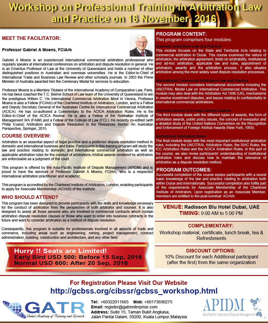 GATR also offer Workshop on Professional Training in Arbitration Law and Practice on 16 November, 2016, Radisson Blu Hotel Dubai, UAE. Please register now using electronic form or download the registration form for workshop registration and submit it along with payment slip at gcbss2016@gmail.com