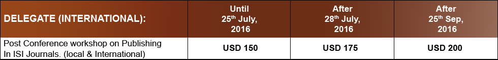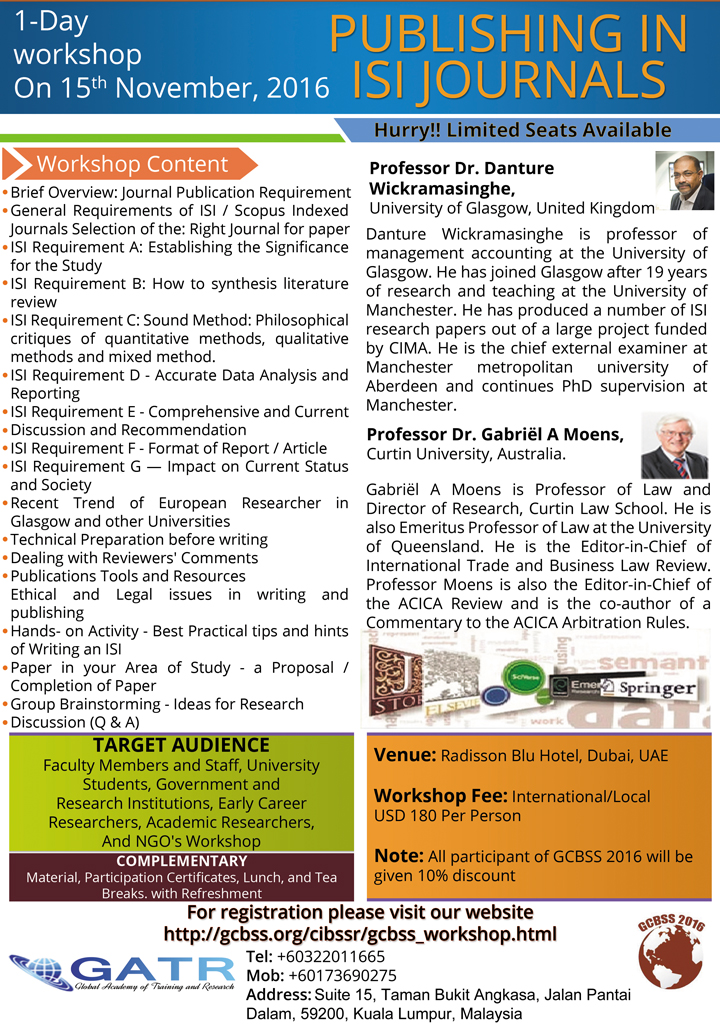 GATR also offer one day workshop on ''How to Publish in High Impact Factor ISI Journals". Please register now using electronic form or download the registration form for workshop registration and submit it along with payment slip at gcbss2016@gmail.com
