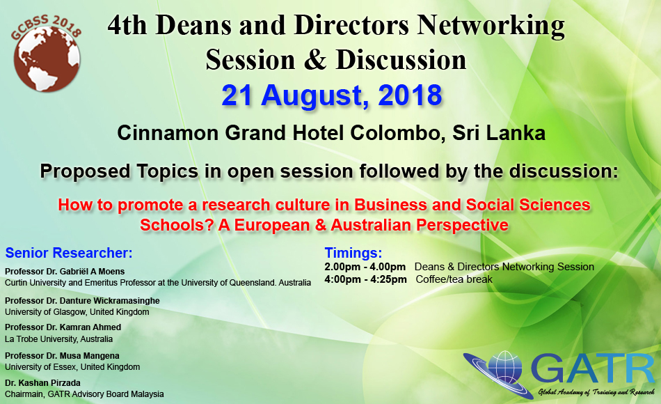 Global Academy of Training and Research (GATR), is a registered research firm in Malaysia that provides platforms for academics and organizations to excel. GATR aims at encouraging young scholars, established researchers, trainers, academic & corporate researchers to conduct meaningful research and provide useful knowledge for the academic and socio-economic development of their respective nations. GATR is organizing the 4th Deans and Directors networking session in Colombo Sri Lanka.