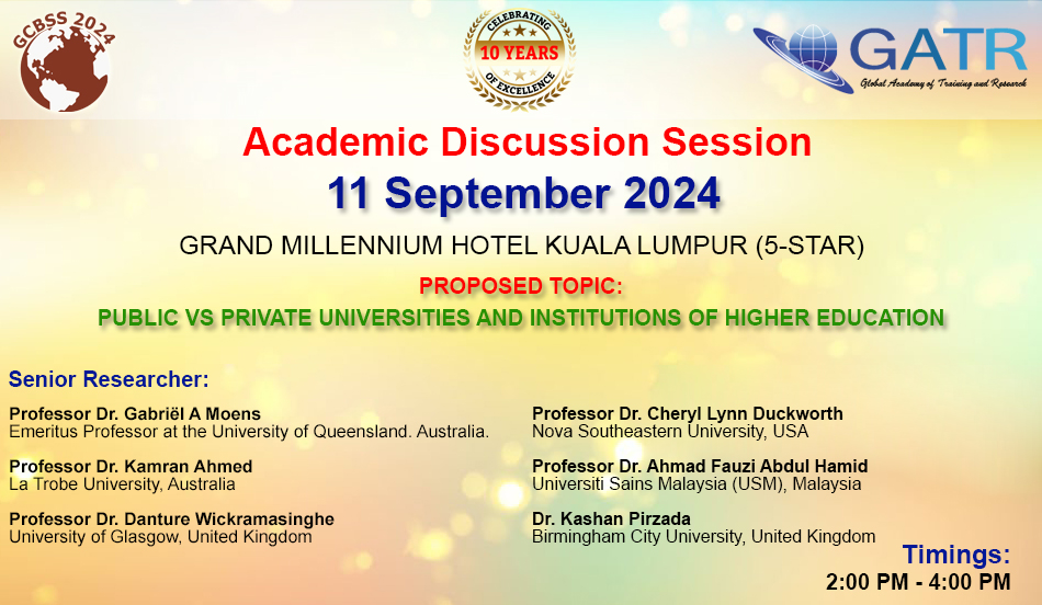Global Academy of Training and Research (GATR), is a registered research firm in Malaysia that provides platforms for academics and organizations to excel. GATR aims at encouraging young scholars, established researchers, trainers, academic & corporate researchers to conduct meaningful research and provide useful knowledge for the academic and socio-economic development of their respective nations. GATR is organizing the academic discussion session in Kuala Lumpur, Malaysia.