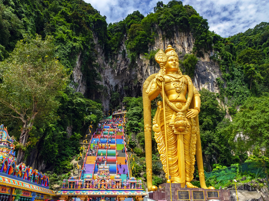 Batu Caves is a limestone hill that has a series of caves and cave temples in Gombak, Selangor, Malaysia. It takes its name from the Malay word batu, meaning 'rock'. The hill was originally known as Kapal Tanggang from the legend of Si Tanggang. The town nearby is named after the Batu Caves limestone formation. The cave is one of the most popular Hindu shrines outside India, and is dedicated to Lord Murugan. It is the focal point of the Tamil festival of Thaipusam in Malaysia. Batu Caves in short also referred as 10th Caves or Hill for Lord Muruga as there are six important holy shrines in India and four more in Malaysia. The three others in Malaysia are Kallumalai Temple in Ipoh, Tanneermalai Temple in Penang and Sannasimalai Temple in Malacca.