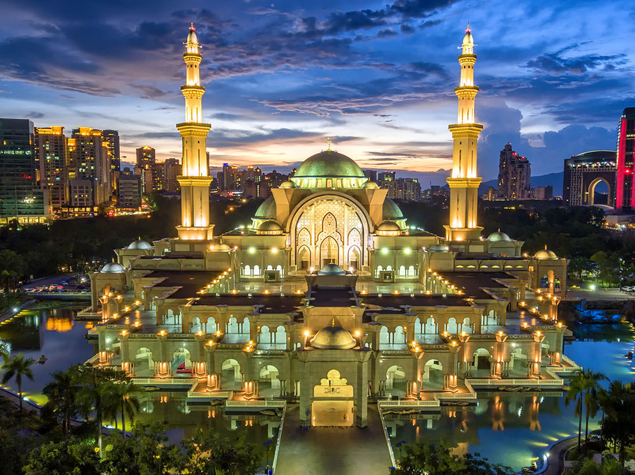 The Kuala Lumpur Mosque, or Masjid Wilayah, was constructed between 1998 to 2000. It is situated on a five hectare site near the Government Office Complex along Jalan Duta. The Wilayah Persekutuan (Federal Territory) Mosque was opened to the public on 25 October 2000 and was officiated by the 12th Yang di-Pertuan Agong, Tuanku Syed Sirajuddin ibni Almarhum Syed Putra Jamalulail. It is the 44th mosque built by the Government within the city limits. The mosque can accommodate 17,000 worshippers at any one time.